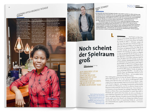 Dies ist NEO. NEO ist neu, frisch, aber auch ungewöhnlich und vielseitig. NEO will die Entwicklung der Neustadt zum Schauplatz urbanen Lebens als Verstärker begleiten. NEO will Kultur unterstützen, will bewegen und Geschichten erzählen, möchte Menschen und Projekte vorstellen mit Ideen für den Stadtteil. NEO mag Musik, Theater, Literatur und Kunst. Unser Magazin verbindet Zeitgeist mit Zeitlosigkeit, Punk mit Straßenrap, Pop mit Literatur und ein stilvolles Design mit hochwertigen Texten, Fotos und Illustrationen. Alles links der Weser. In dieser ersten Ausgabe beschäftigen wir uns mit dem Machen, Sehen, Hören, Gucken, Genießen, Treffen, Kennenlernen und Träumen der Neustadtmenschen.“
